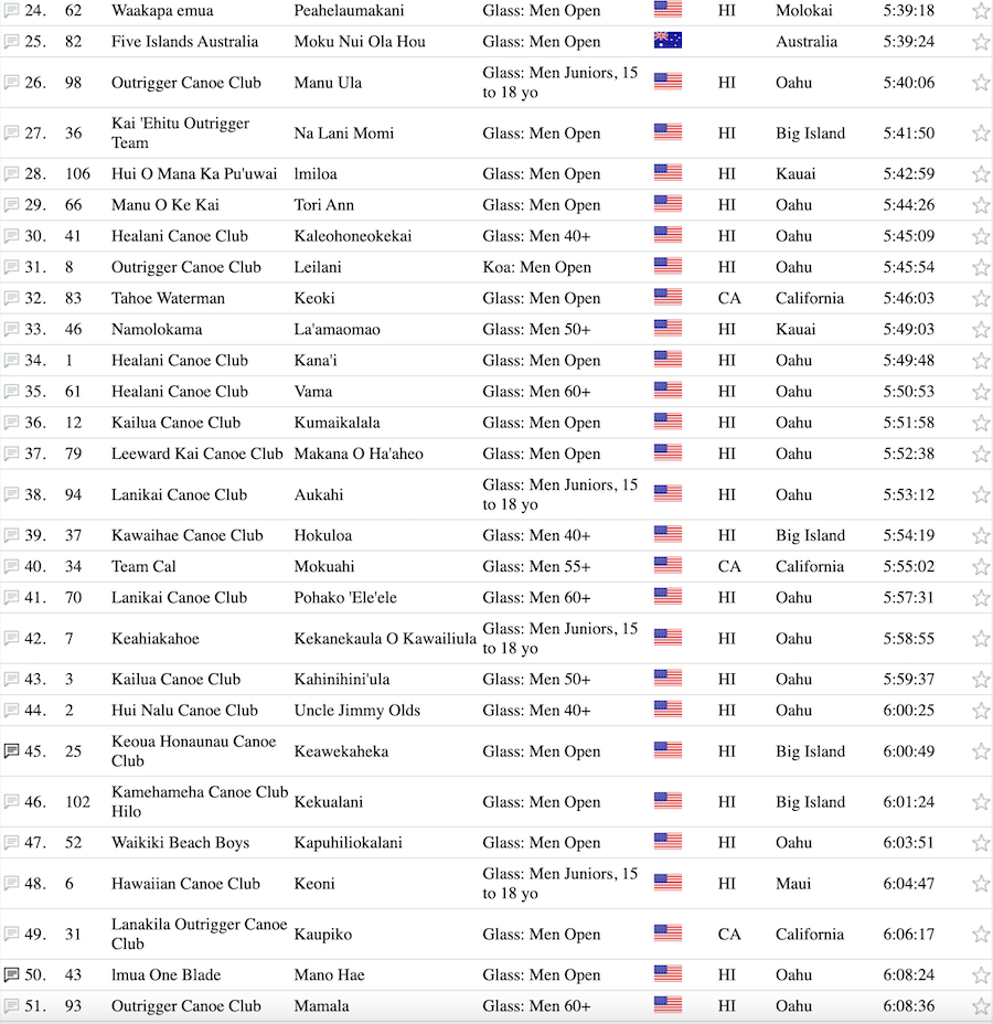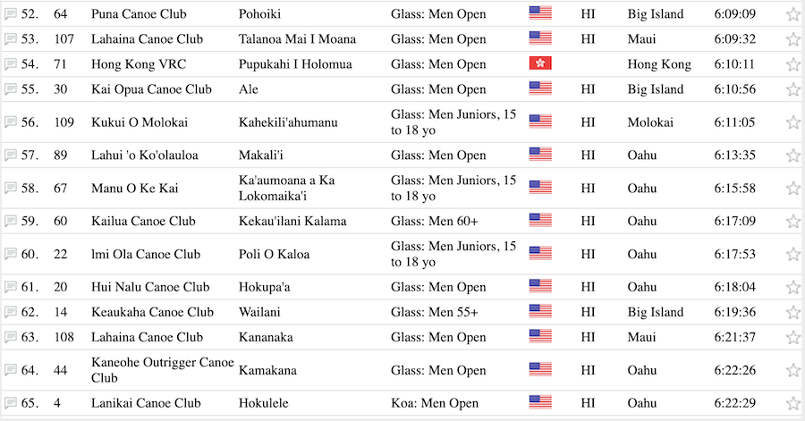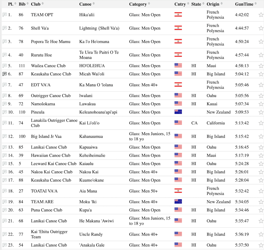 With the top four teams all from Tahiti, the race marked total Tahitian domination in Hawai‘i. The first two Hawaiian crews, Maui’s Wailea Canoe Club and Keaukaha Canoe Club, came in fifth and sixth, followed by another Tahitian crew, EDT Va‘a, in seventh. New Zealand’s top team rounded out the top ten.